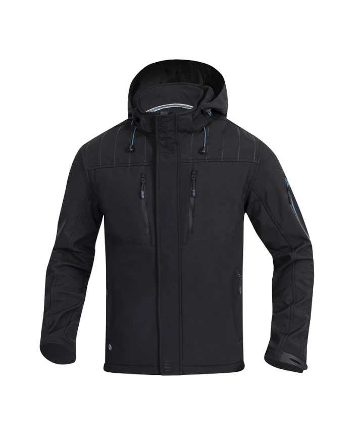Popis a technické informácie: luxusná pánska softshellová bunda s dekoratívnou potlačou na sedle a rukávoch: modré doplnky: vodeodolnosť 5 000 mm, priedušnosť 5 000 g/m²/24h: odnímateľná kapucňa so sťahovaním pomocou stopérov: zapínanie na zips krytý légou na suchý zips: 4 vrecká na zips, vrecko na rukáve: nastaviteľné rukávy pomocou suchých zipsov: sťahovanie spodného lemu pomocou stopérovvrchný materiál: 93% polyester, 7% elastan, TPU membrána