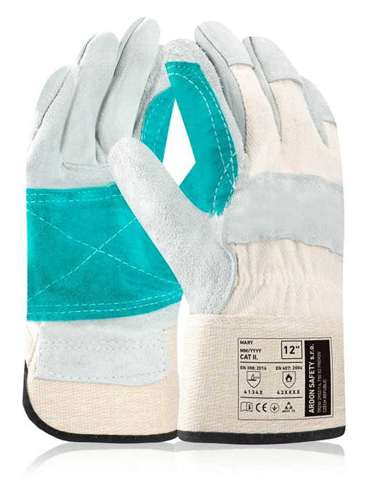 Materiál: zosilnená dlaň a ukazovák z hovädzej štiepenky, chrbát z bavlnenej tkaniny, vystužená manžeta