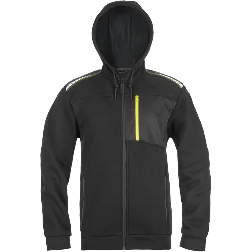 • pánská mikina s kapucí se zapínáním na zip • 2 boční kapsy • 1 náprsní kapsa na zip • zesílená ramena s reflexními pruhy • elastický spodní lem a manžety rukávů