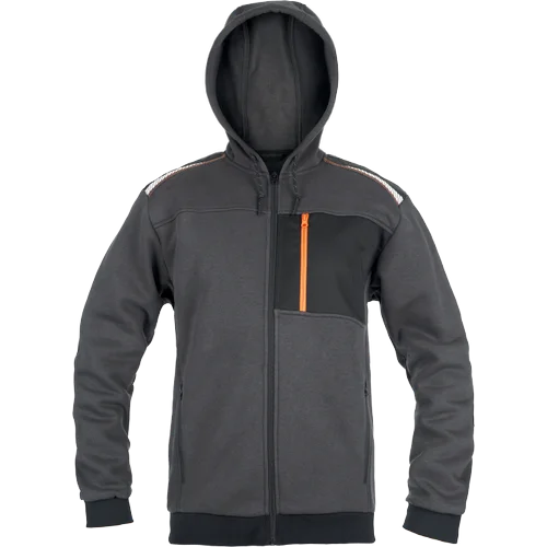 • pánská mikina s kapucí se zapínáním na zip • 2 boční kapsy • 1 náprsní kapsa na zip • zesílená ramena s reflexními pruhy • elastický spodní lem a manžety rukávů