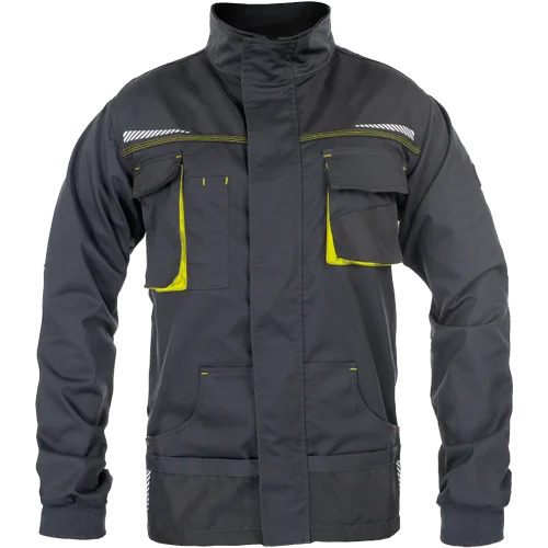 • pánská vysoce odolná strečová pracovní bunda • přední zapínání na zip kryté légou • 2 boční kapsy • 2 náprsní kapsy, jedna na mobilní telefon • Oxford 600D zesílení v oblasti ramen a loktů • tištěné reflexní segmentové detaily • pletené elastické manžety rukávů