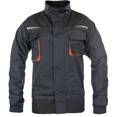 • pánská vysoce odolná strečová pracovní bunda • přední zapínání na zip kryté légou • 2 boční kapsy • 2 náprsní kapsy, jedna na mobilní telefon • Oxford 600D zesílení v oblasti ramen a loktů • tištěné reflexní segmentové detaily • pletené elastické manžety rukávů