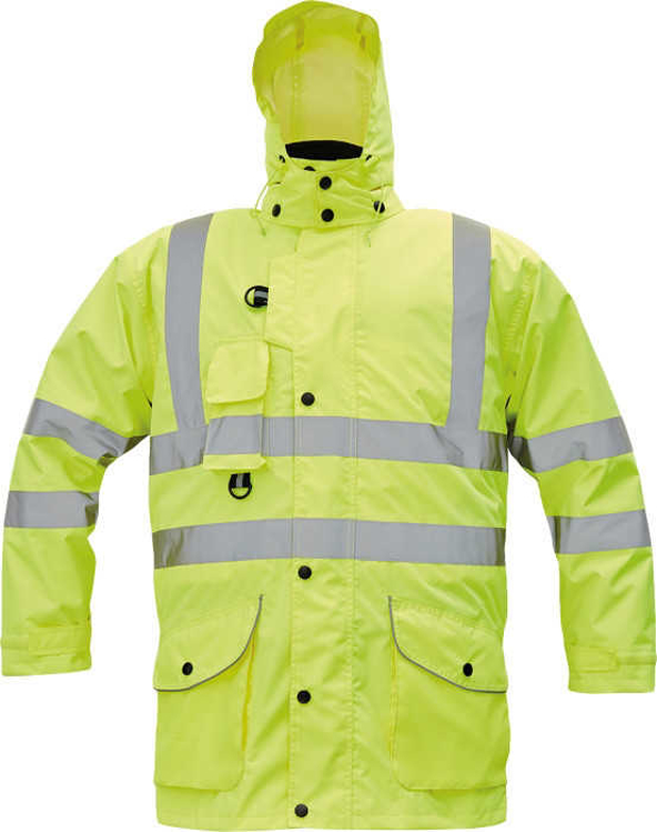 Popis: pánska zateplená bunda 7 v 1 s vysokou viditeľnosťou s reflexnými pruhmi; odopínacia vrchné vetruodolná a vodeodolná bunda s lepenými švami a odopínacou kapucňou; obojstranná samostatná spodná bunda s mnohými multifunkčnými vreckami