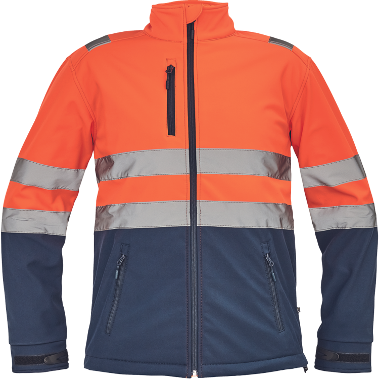 Popis: pánska HI-VIS softshellová bunda s reflexnými pruhmi cez ramená, v bokoch a na rukávoch; priedušná TPU membrána odolná dažďu; zapínanie na zips; 1 náprsné vrecko a 2 postranné vrecká na zips; elastické lemy rukávov a bokov