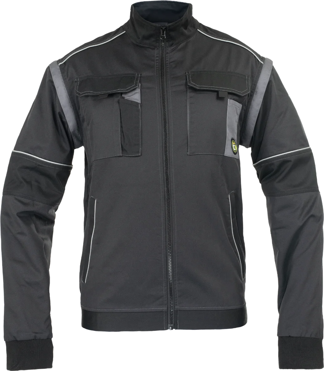 • pánská pracovní bunda se zapínáním na zip krytým légou • 2 boční kapsy • 2 náprsní kapsy s klopou na suchý zip • zesílení namáhaných částí ramen • odepínací rukávy s pružnými manžetami • pružný spodní obvod v pase • reflexní prvky