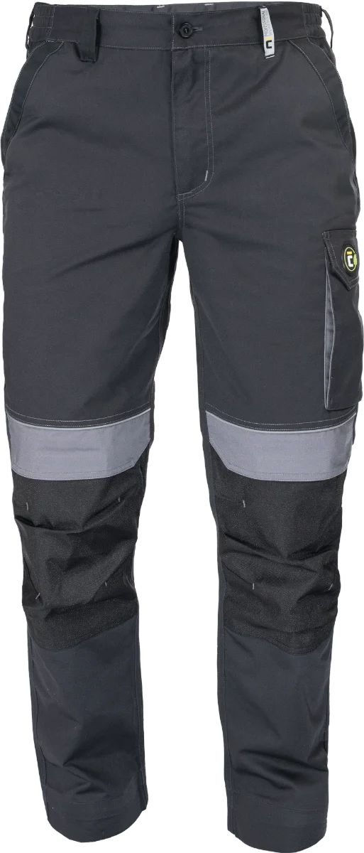 • pánské pracovní kalhoty s elastickým pasem • 2 přední kapsy • 1 levá stehenní kapsa • 2 zadní kapsy se zapínáním na suchý zip • zesílená oblast kolen s možností vložení chráničů kolen • reflexní prvky • nastavitelná délka nohavic