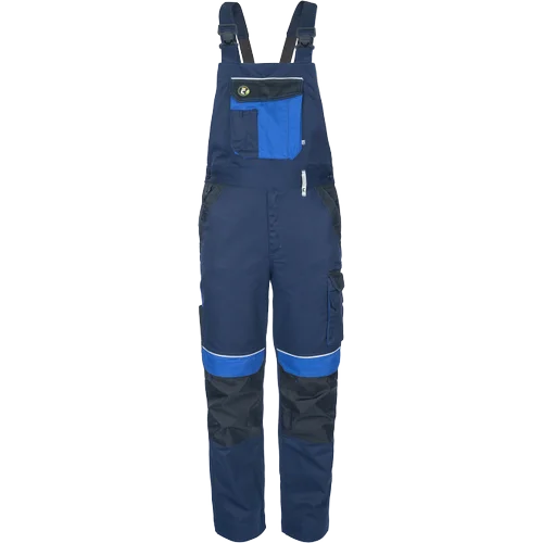 • pánské pracovní laclové kalhoty s elastickým pasem • 2 přední kapsy • 1 stehenní kapsa • 1 velká náprsní kapsa se zapínáním na suchý zip • 2 zadní kapsy se zapínáním na suchý zip • zesílená oblast kolen s možností vložení chráničů kolen • reflexní prvky • nastavitelná délka nohavic