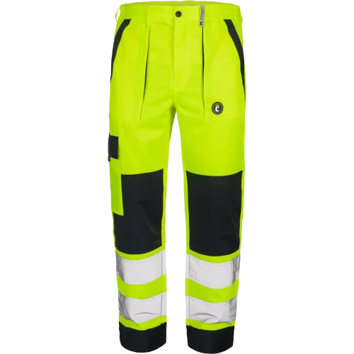 • pánské HI-VIS pracovní kalhoty s elastickým pasem • 2 přední kapsy • 1 stehenní kapsa • 2 zadní kapsy se zapínáním na suchý zip • 2 šité 7,5 cm široké reflexní pruhy na spodních částech nohavic • zesílená oblast kolen • nastavitelná délka nohavic