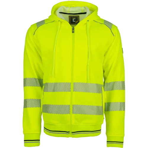 • celopropínací HI-VIS mikina s kapucí ze směsového úpletu bavlny a polyesteru zevnitř nepočesaná • dvojitá kapuce s kontrastním úpletem v barvě zipu a dekorativního prošití • pružné náplety na rukávech a spodním obvodu • tištěné reflexní segmentované 5 cm pruhy okolo pasu, rukávů a přes ramena