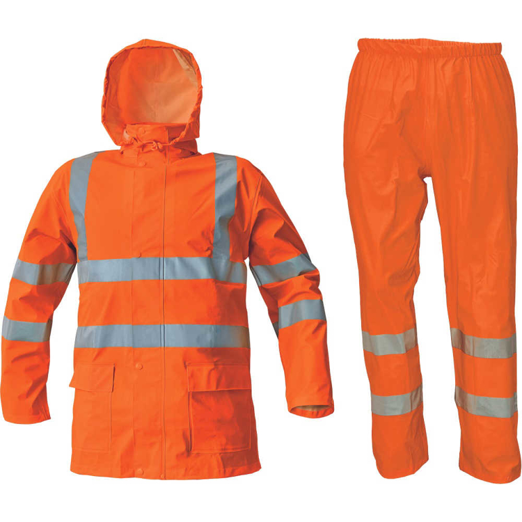 • nepremokavý a vetruodolný komplet bundy a nohavíc • ¾ plášť s kapucňou v golieri • nohavice s gumou v páse • reflexné pruhy bundy po obvode pása, bokov, rukávov a cez ramená • reflexné pruhy nohavíc po obvode spodných nohavíc • dve predné vrecká bundy kryté • spodný lem rukávov je možné upraviť cvokom • HI-VIS prevedenie iba v žltej a oranžovej farbe