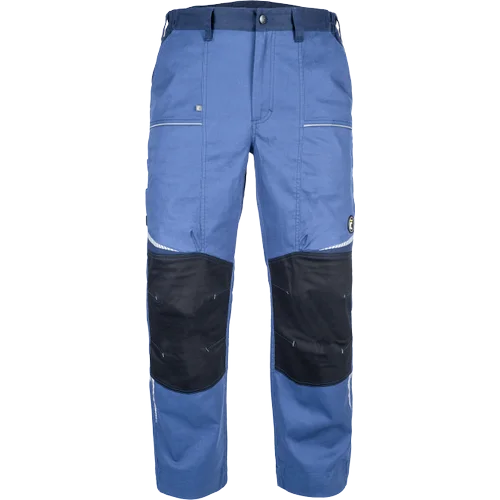 • pánské pracovní kalhoty ze strečové tkaniny • pružný pas s poutky na opasek • 2 přední kapsy, 2 zadní kapsy • 2 stehenní ventilační mesh kapsy na zip • 1 multifunkční kapsa na pravém stehně • zesílené kolenní části pro vložení kolenních chráničů • reflexní lemování a tištěné reflexní detaily • nohavice prodloužitelné o 5 cm