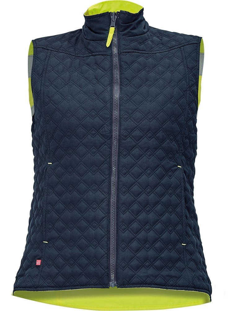 Popis: dámská oboustranná prošívaná vesta • jedna strana v hi-vis růžové barvě v kombinaci s reflektivními pásky • druhá strana tmavě modrá s dekorativním prošíváním • postranní kapsy na zip z obou stran vesty