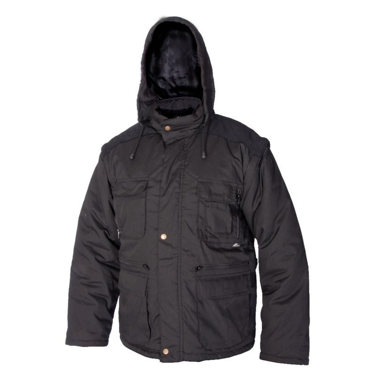 Popis: zateplená bunda, kapucňa v golieri, vystužené ramená, odopínateľné rukávy s elastickou manžetou, sťahovacia šnúrka v spodnej časti, 14 vreciek.