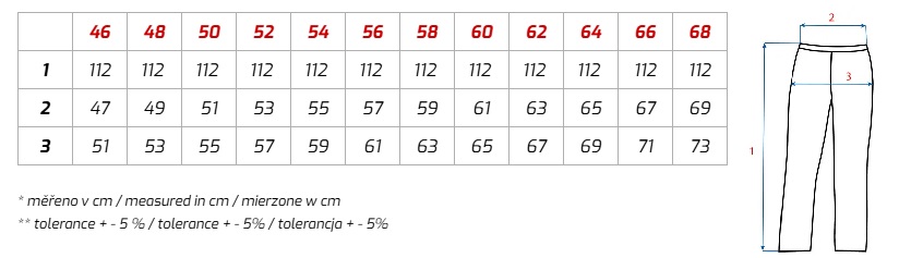 Pánske montérkové nohavice, pás s pútkami na opasok, vzadu do gumy, predné vrecká, bočné vrecko na zvinovací / skladací meter, bočné vrecko na mobil / peňaženku, zdvojené kolená, zadné vrecko s chlopňou, reflexné pruhy.