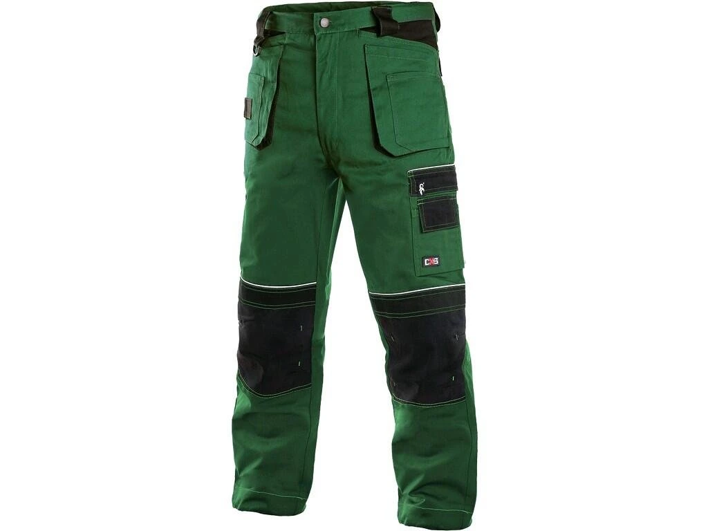 Pánske montérkové nohavice, pás s pútkami na opasok, vzadu do gumy, predné vrecká s pútkami na náradie, multifunkčné vrecká na oboch stranách, kolená zosilnené 600D polyesterom s možnosťou vloženia kolenných výstuh, dve zadné vrecká, jedno na suchý zips, reflexné doplnky.