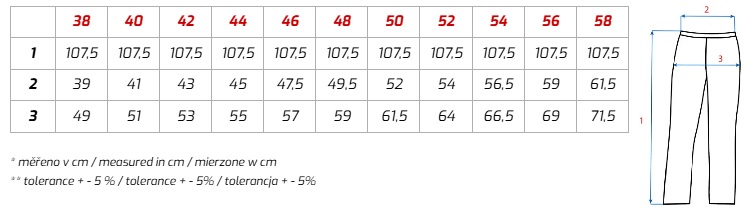 Popis: Dámske montérkové nohavice, strečová tkanina umožňujúce voľný pohyb, pás s pútkami na opasok, predné vrecká s vreckom na zips, multifunkčné vrecká na oboch stranách, kolená zosilnená 600D polyesterom, dve zadné vrecká - jedno s príklopkou, zadný spodný lem nohavice vystužený 600D polyesterom, reflexné doplnky.