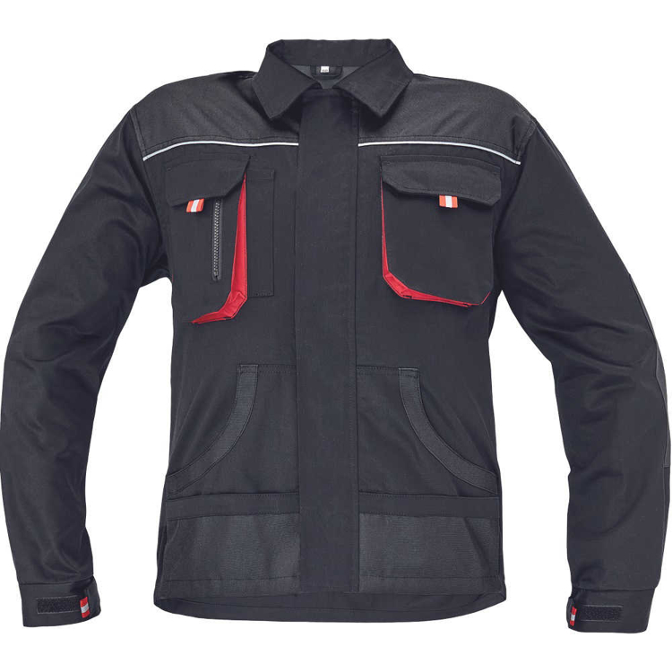 pánska pracovná bunda; zapínanie na zips kryté légou; 2 náprsné vrecká s chlopňou na suchý zips; 2 multifunkčné postranné vrecká v páse; polyester Oxford zosilnenie v lakťových častiach a ramenách.