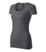 elastický materiál na zachovanie tvarovej stálosti, priliehavý strih s bočnými švami, hlbší okrúhly výstrih, úzky výstrih z rebrového úpletu 1:1 s 5 % elastanu, vnútorná časť výstrihu je zapečatená kontrastnou páskou, ramenné švy spevnené páskou, krátke priliehavé rukávy, ozdobné prešitie