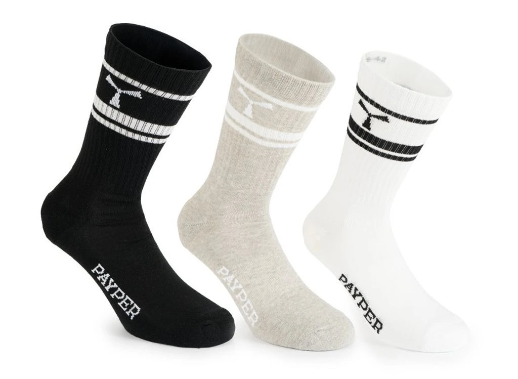 Popis: Ponožky do půli lýtek, vyrobené z organické bavlny a recyklovaného polyesteru. Tlumící opora na patě a špičce. Nezaměnitelná vrtule Payper na žebrovaném okraji a logo na chodidle.