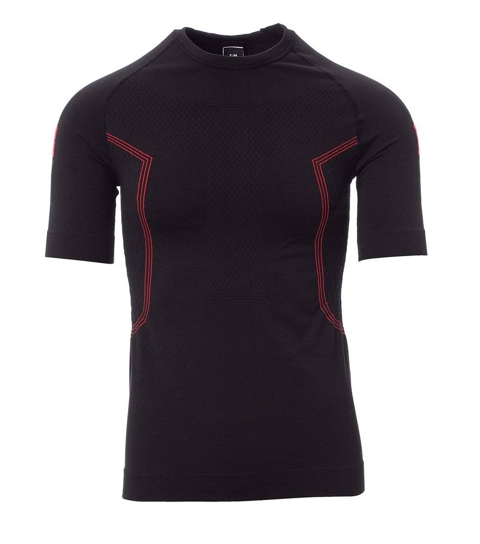 Popis: Pánske termo tričko s okrúhlym výstrihom a krátkym raglánovým rukávom. Mäkký strečový úplet, špeciálne textúry na hrudi a na chrbte, na bokoch špirálové reliéfne motívy na zaistenie správnej priedušnosti a stálej termoregulácie. Golier, spodná časť a lemy rukávov Zebrované z rovnakého materiálu, pre väčšie pohodlie. Ergonomická tubulárna štruktúra zaisťuje dokonalé prispôsobenie fyziognómii tela.