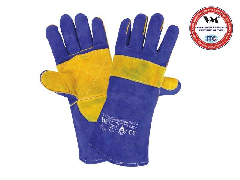 Popis: hrubá štiepaná modrá hovädzia koža, impregnovaná voskom, dvojitá dlaň, kryté švy, šitá kevlarovou niťou