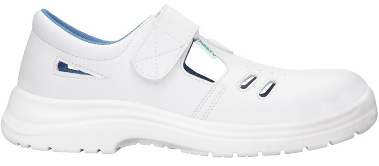 Popis: biele sandále so zvrškom z umývateľnej kože z mikrovlákna s oceľovou špičkou, vnútri priedušná tkanina zabezpečujúca absorpciu vlhkosti, podrážka z polyuretánu, vhodné pre zdravotníctvo a potravinárstvo.